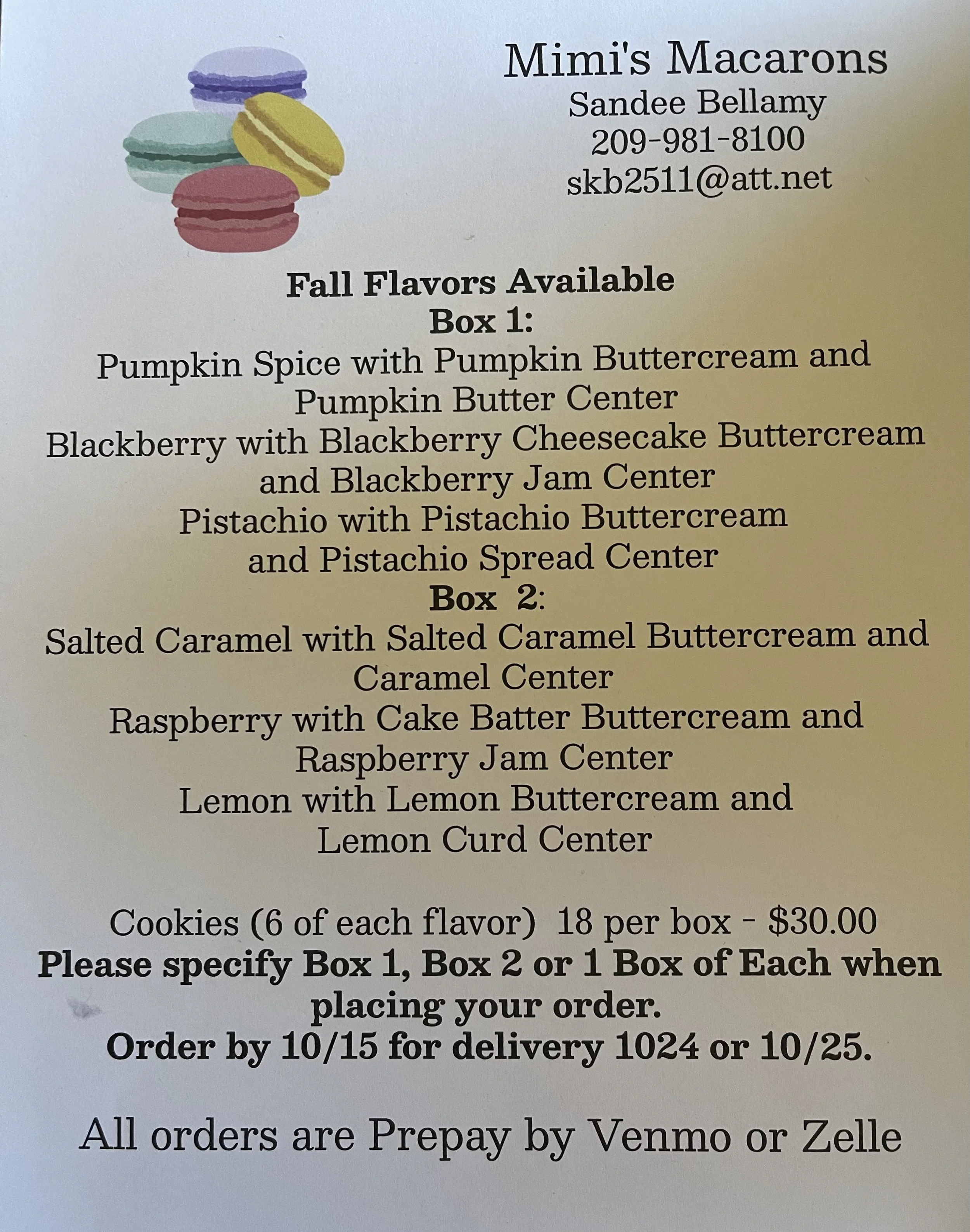 PRE-ORDER FOR MIMI’S MACARONS for Figamarole Fall Craft Fair MUST BE PLACED BY 10/15/25. Payments accepted by Venmo or Zelle. Contact Sandee Bellamy at 209-981-8100 OR SKB2511@ATT.NET. See choice of 2 different assortments on flyer.